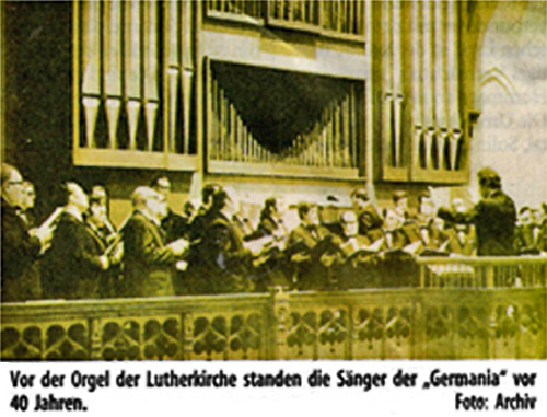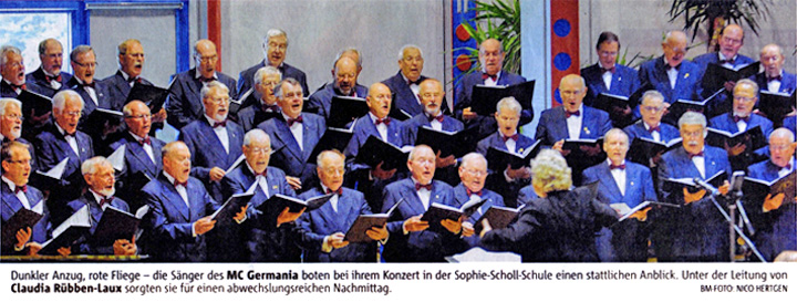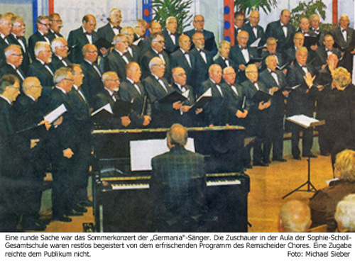 rga Artikel vom 17.12_2011 Männerchor folgt dem zarten Mädchensopran Mit einem umfangreichen Programm feierte der Rem-scheider Männerchor Germa-nia vor 40 Jahren sein 100- jähriges Bestehen. Dazu ge-hörte auch ein Kirchen-konzert in der Lutherkirche.Unser heutiges „Historisches Foto" erinnert an dieses Er-eignis. Unter der Leitung des Dirigenten Professor Her-mannjosef Rübben trugen die Sänger unter anderem geist-liche Werke von Johann-Sebastian-Bach, Paul Hinde-mith und Hans Friedrich Michelsen vor. Unter den Solisten waren die Tochter des Chorleiters, Claudia Rübben (Gesang und Quer-flöte), Klaus Tilly (Bariton) und Martin Theill (Orgel). Claudia Rübben trug, so schilderte es der RGA-Chronist, „mit kindlicher Frische" zwei Werke auf ihrer Querflöte vor und sang mit „zartem Mädchensopran". Ein Höhepunkt der 100-Jahr-Feiern des Männerchores war bereits im März 1971 der Festakt im Stadttheater. Die Ehrungen nahm der damalige Bundesinnenminister und spätere langjährige Außenminister Hans-Dietrich Genscher vor. Auch 140 Jahre nach seiner Gründung ist die „Germania" noch aktiv. In diesem Jahr standen viele Auftritte an. Der nächste wird morgen, Sonntag, 18. Dezember, 17.30 Uhr das Weihnachtskonzert in der Kirche St. Bonaventura in Lennep sein. ate bm Artikel vom 12.12_2011 Zwei Chöre singen Weihnachtslieder REMSCHEID (MM) Die Besucher des/ Adventskorizerts des Frauenchores Remscheid und des Remscheider Männerchores Germania bekamen ein hochwertiges musikalisches Dinner serviert. Konstanze Jarczyk an der Harfe wirkte so erfrischend wie ein Glas Sekt und Reiner Vallo an der Orgel belebend wie ein guter Rotwein. Die Erwartungen der Besucher in der ausverkauften Lutherkirche an ihre Chöre und die Instrumentalisten waren hoch. Diese Erwartungen waren nach viel zu kurzen 100 Minuten mehr als erfüllt worden. Die rund 130 Sänger boten unter der Leitung von Claudia Rübben-Laux ein abwechslungsreiches Programm. Die Musik wollte Kindheits- erinnerungen an die Weihnachtszeit wiedererwecken. Mit bewährtem Konzept konnten die beiden Chöre ihre Zuhörer an diesem Abend begeistern. Neben flotten Liedern aus dem Gottesdienst oder Gospels brachten sie auch die klassischen Advents- und Weihnachtslieder zu Gehör. Mit gemeinsamen Liedern stimmten sie auf den Abend ein. Im en ersten Teil übernahm der Frauenchor die Regie. Verbunden wurden die einzelnen Blöcke durch das Harfenspiel von Jarczyk. Raumfüllend und filigran strömte die Harfenmusik durch das Kirchenschiff. Bei „Pas-sacaglia" von Händel hatte man das Gefühl, ein Sonnenstrahl fällt in den Raum. Die Melodie von „La Source" von Alphonse Hasselmans kamen träumerisch rüber. Augen zu und sich verwöhnen lassen, konnte man die Harfenpassagen zusammenfassen. Mit Johann Sebastian Bachs „Nun kommt der Heiden Heiland" verband Vallo die beiden Teile des Konzerts. Stimmgewaltig hatte die „Germania" den Stil- und Liedmix des Frauenchores aufgegriffen, modernes und altes im Repertoire. Ein kleiner Zwischenfall kurz vor Schluss erschreckte Sänger wie Zuschauen Ein Schwächeanfall eines Sängers. Ein Arzf wurde gerufen. Kurze Zeit später gab es Entwarnung. „Er lacht schon wieder. Alles wird gut", sagte die Chorleiterin. Das Konzert schloss mit dem traditionellen Chorlied „Weihnachten, wie bist du schön". So. 18 Dezember, 17.30 Uhr, wird das Adventskonzert in St. Bonaventura wiederholt. rga Artikel vom 12.12_2011 Kein Durchkommen beim Weihnachtstreff Dort stehen unter anderem die EMA-Jazz AG. der Remscheider Frauenchor, der. Männerchor „Germania" oder das Mettmanner Duo auf der Bühne. Beim Weihnachtstreff gibt's bis zum Abend kein Durchkommen. Veranstalter Lennep Offensiv freut sich über ungezählte Besucher, die sich an jeder Menge Glühwein wärmen. rga Artikel vom 12.12_2011 Sänger sorgen für eine Atempause Adventskonzert in der Lutherkirche stimmt auf die Festtage ein. Von Daniel Diekhans Anstrengender Advent. Die geschäftige Vorweihnachts-zeit lässt einen kaum zur Ruhe kommen. Dabei kann schon ein wenig Musik lindernd wirken. In diesem Sinne sorgte auch das dies-jährige Adventskonzert in der Lutherkir-che für eine wohl-tuende Atempause.Mit der richtigen Mischung fröhlicher und besinnlicher Klänge stimmten der Rem-scheider Frauenchor und der Männerchor „Germania" am Freitag ihre Zuhörer auf Weihnachten ein. Die Soli-sten des Abends waren Kon-stanze Jarczyk an der Harfe und Reiner Vallo an der Orgel. Die künstlerische Leitung lag in den kompetenten Händen von Claudia Rübben-Laux. Schon der Anfang ist stark. Mit einer kraftvollen Version von „Beten und Lobsingen" verschaffen sich die beiden Chöre beim Publikum Gehör. Nach dem gemeinsamen ersten Teil sind die Frauen an der Reihe. Bei Michael Schmolls „Kyrie" und „Gloria" wiegen sich die Sängerinnen im Takt der Musik und klatschen in die Hände wie ein Gospelchor, während Claudia Rübben-Laux mit präzisen Handbewegungen rasante Wechsel in Tempo und Dynamik anzeigt. Nach dieser frischen Einlage kehrt wieder Ruhe ein. Beim Evergreen „Rudolph, the red-nosed Reindeer" hinterlässt der kleine Frauenchor mit seinen jungen Stimmen einen guten Eindruck. Durch Vielfalt überzeugt auch der Männerchor. „Ich bete an die Macht der Liebe" wird zart und innig gesungen. Überragend ist die Interpretation des Spirituals „All Night, all Day". Ein volltönender Bassist gibt den Vorsänger, auf den der Chor in perfektem Timing antwortet. Der „Andachtsjodler" schließlich beweist, wie anrührend Gesang auch ganz ohne Worte sein kann. Trotz Schwächeanfall nimmt das Konzert ein gutes Ende Der Kreis schließt sich, wenn die beiden Chore den letzten Teil des Konzerts gemeinsam bestreiten. Leider trübt sich die Stimmung, als einer der Choristen bei „Süßer die Glocken nie klingen" einen Schwächeanfall erleidet. Sobald jedoch klar ist, dass es dem Sänger wieder gut geht, nimmt das Konzert doch noch ein gutes Ende. Bei „Tochter Zion" stimmen