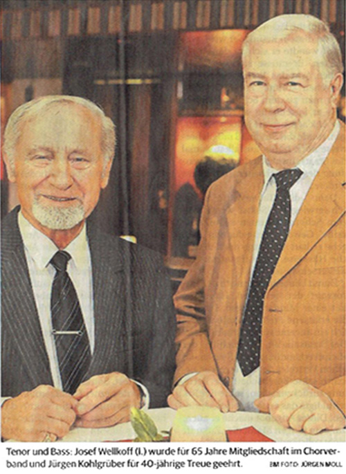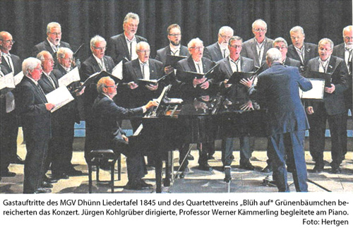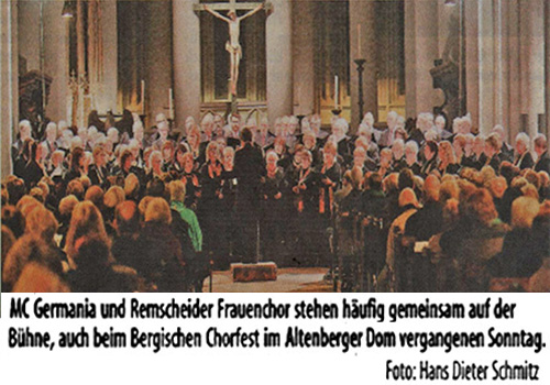 nn Artikel v. 2014_12-16 Einstimmung auf die Festtage Männerchor „Germania“ und der Frauenchor Remscheid gaben ein Doppelkonzert. VON ANNA MAZZALUPPI Der Remscheider Männerchor „Germania“ veranstaltete zusammen mit dem Frauenchor Remscheid gleich zwei Mal ein Konzert mit dem Titel „Folget dem Stern!“. Zu den Auftritten in der Lutherkirche am Freitagabend und in der Kirche St. Bonaventura in Lennep am dritten Advent hatten die beiden Chöre ein umfangreiches und unterhaltsames Programm zusammengestellt. Von den klassischen Weihnachtsliedern wie „Alle Jahre wieder“ oder „O du gnadenreiche Zeit“ hin zu amerikanischen Songs wie „Frosty the snowman“ oder „Rudolf the red-nosed reindeer“ war unter den über 30 Songs alles vertreten, was das besinnliche Herz in der Adventzeit begehrt. Die Frauen unter Leitung von Claudia Rübben-Laux überzeugten besonders in ihrer lieblichen Darbietung von „Kling Glöckchen“ und zauberten mit der wirklich schön gesungenen Version von „Weihnacht will’s nun wieder werden“ vorweihnachtliche Stimmung in die Kirche. Die Begleitung an der Orgel übernahm Kirchenmusiker Peter Bonzelet in überzeugender Manier. Stimmgewaltig und zugleich auch zart zeigten sich die Sänger unter sich mit Dirigent Jürgen Kohlgrüber bei Gus Antons „O Herr, gib' Frieden“. Meistens sangen die Herren dabei A cappella. Für einen Gänsehautmoment sorgte das Bläserquintett „Die Dabringhauser Musikanten“, das die Sängerinnen und Sänger an den Abenden unterstützte. Zum traditionellen „Andachtsjodler“ verteilten sich die Musiker in der Kirche. Zuerst erklang die Trompete, die durch die zweite ergänzt wurde. Nach und nach kamen Horn, Posaune und Tuba hinzu und ließen so einen wunderschönen, andächtigen Klang entstehen. Mit einem Medley amerikanischer Weihnachtslieder und andere Instrumentalstücke sorgte das Quintett im Wechsel mit dem Chorgesang für Dynamik und einen eigenen Konzertcharakter. Der Wechsel der Musiker wurde gekonnt durch das gemeinsame Singen mit den Besuchern kurzweilig gestaltet. Ein imposantes Bild bot sich dem Publikum, als alle Beteiligten zusammen vorne im Kirchenschiff standen und als Highlight mit der Unterstützung des Bläserquintetts „Süßer die Glocken nie klingen“ anstimmten. Ein schöner und kurzweiliger Abend, der zur Adventszeit passt und auf das besinnliche Fest einstimmte. Volkstrauertag: Remscheid trauert um die Kriegstoten Seit 1952 gedenkt die Bun-desrepublik Deutschland am zweiten Sonntag vor dem ersten Advent der Kriegsto-ten und der Opfer der Gewaltherrschaft aller Natio-nen. Der Volkstrauertag steht somit am Ende des christlichen Kirchenjahres, das theologisch durch die Themen Tod, Zeit und Ewigkeit geprägt wird.Die Remscheider reihten sich gestern ins bundesweite Ge-denken ein. Gemeinsam mit Oberbürgermeister Burkhard Mast-Weisz gingen sie vom Parkplatz der Sportanlage Reinshagen aus zum Ehren-hain. Für andächtige Musik sorgten das Blechbläseren-semble der Bergischen Sym-phoniker sowie der Männerchor Germania. Pfarrer Dr. Dieter Jeschke hielt die Gedenkansprache. rga Artikel v. 28.10.2014 Zwei Chöre machen gemeinsame Sache BERGISCHES CHORFEST MC Germania und Remscheider Frauenchor sangen im Dom kirchliche Musik. Von Nandor Hulverscheidt Die Konzertreihe des Vereins „Bergisches Chorfest“ ging am Sonntag mit einem beeindruckenden Programm zu Ende. Sieben Chöre aus sechs bergischen Landkrei-sen präsentierten eine viel-fältige Auswahl kirchlicher Musik. Dazu passte das majestätische Hauptschiff des Altenberger Doms als Konzertsaal ausgezeichnet.Es eröffnete Domorganist Rolf Müller mit Johann Sebastian Bachs „Symphonie zur Ratswahl Cantata“, gefolgt vom Frauenchor Pro Musica aus Gummersbach unter der Leitung von Gus Anton, Ehrenvorsitzender des Chorfestvereins. Nachfolger war der Radevormwalder Männerchor mit Albert Niessen an der Spitze, der durch das mit viel Geduld intonierte "Vater unser“ von Nicolais Rimski-Korsakow uberzeugte. Es folgte der Evangelische Kirchenchor Langenberg mit einer der längsten Kompositionen im Programm, der „Polnischen Messe" von Jan Adam Maklakiewicz. Der MGV Rösrath und Leiter Stefan Wurm gefielen, ohne Orgelbegleitung, mit dem klar artikulierten „Jubilate Deo“ von Colin Mawby. Zwei Violinen und ein Cello begleiteten das Vocalensemble „a cappella“ unter Leiter Dirk van Betteray Auszügen aus „Stabat Mater“ von Giovanni Battista Pergoksi. Dann war die Zeit gekommen für den großen Auftritt der Remscheider Chöre. Claudia Rübben-Laux führte den Verbund vom Männcrchor Germania und dem Remscheider Frauenchor sicher durch Kyrie, Gloria, Credo, Sanctus, Benedictus und Agnus Dei von Hermannjosef Rübben „Missa serena für gemischten Chor und Orgel“. Es sei immer wieder eine Herausforderung. aus über 40 Sängern eine gesangliche Einheit zu formen, so Rübben-Laux. „Dazu kommt, dass man darauf achten muss, die Differenzen zwischen den einzelnen Stimmen zu erhalten“, betont die stellvertretende Landeschorleiterin. Besonders die Dynamik zwischen Piano und Forte sei dabei wichtig, erklärte Rübben-Laux und fügte schmunzelnd hinzu: „Laut singen können sie eigentlich alle.“ Viel verdienten Applaus gab es dann auch vom reichlich erschienen Publikum nach dem gemeinsamen Schlussgesang. Die Germania lud sich Gäste ein Die Zuhörer konnten einen Konzertabend im Saal des CVJM genießen, den die Chöre mit vielen fröhlichen und besinnlichen Liedern sehr abwechslungsreich gestalteten. VON SABINE NABER Wenn sich befreundete Chöre zu einem Gemeinschaftskonzert zusammenfinden, dann garantiert das den Gästen einen Hörgenuss. Und so war es am Samstagabend, als der Remscheider Männerchor Germania unter der Überschrift „Freunde singen" zu einem Konzert in den CVJM-Saal eingeladen hatte. Das tolle Programm begeisterte die Gäste Schon Stunden vor Konzertbeginn trafen sich die Freunde der Chormusik bei herrlichem Spätsommerwe