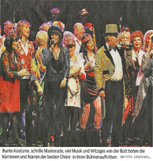 Artikel Bergische Morgenpost v. 08. Februar 2016 Chöre feiern wie „de Jecken am Rhing“ „Knatsch, verdötscht“ im Teo Otto Theater - Frauenchor Remscheid und MC Germania gestalteten buntes Programm. VON STEFANIE BONAREMSCHEID Warum in die Ferne schweifen ... zum 28. Mal bescherten der Frauenchor Remscheid und der Remscheider Männerchor Germania den Jecken vor Ort eine Karnevalsveranstaltung, die den Vergleich mit derer in den Rheinmetropolen nicht zu scheuen braucht. „Knatsch verdötscht“ bot an zwei Abenden einen Potpourri aus guter Unterhaltung und viel schöner Musik. Auch wenn am Freitag das Publikum nicht ganz so zahlreich erschienen war wie in den Vorjahren, tat das der Stim-mung und der Lust an der Maskerade keinen Abbruch. Bunte Hüte, schrille Brillen, farben- prächtige Perücken - die Zuhörer hatten sich ähnlich ideenreich in Schale geschmissen wie die Prota-gonisten auf der prächtig ge-schmückten und illuminierten Bühne. „Mit der Pappnas geboren“ sind nicht nur die „Jecken am Rhing" -das stellten die Chöre mit dem Black Fööss- Stimmungsmacher „Viva Colonia" gleich zu Beginn unter Beweis. Schlag auf Schlag boten die Titel aus den närrischen Hitparaden von gestern und heute viel Potenzial zum Mitsingen und -schunkeln. Und als Brunhilde Meier „Mir halde zesamme“ anstimmte, nutzteein Paar sogleich seine Sitzposition am Rande des Saals und waizerte über das Podest neben den Stuhlreihen. Dass sich aus den Reihen der Chöre so viele Mitglieder finden, die solistisch, im Duett oder in kleinen Gruppen in Erscheinung treten, ist aller Ehren wert. Besonders gefragt waren dabei die Frauenchor- Vorsitzenden Katrin Werth und Katja Hermanns. die in fliegendem Kostümwechsel immer wieder in neue Rollen schlüpften. Ein Kracher dabei das „Bickendorfer Büdje“, das die Damen stimmstark und in 1A-Kölsch präsentierten. Dem stand Anita Dönsbach in der Bütt in nichts nach, skizzierte sie doch das wahrlich turbulente Leben einer Familie aus der Domstadt. Männerchor-Vorsitzender Heinz-Georg Hiister wird nach den Konzerten ordentlich in die Tasche greifen müssen. Hat er doch mit seinem Chorbruder Christoph Lange gewettet, dass es diesem nicht gelingen werde, zehn Mitglieder des Remscheider Schülzenvereins dazu zu gewinnen, sich zu einem eigenen Beitrag bei „Knatsch verdötscht" auf der Bühne einzufinden. Wette verloren, jetzt muss der Chorvorsitzende hundert Liter Bier spendieren, denn die Schützen-Abordnung brachte die kölsche Schützenhymne vom „Schötzefess“ mit ordentlich Schwung zu Gehör. Natürlich freute sich das Publikum über den Besuch der Kölner Tanzgruppe „Höppemötzjer“, die die Chöre für die Auftritte engagiert hatten. Überdies überzeugte Chorleiterin Claudia Rübben-Laux wieder als Moderatorin mit viel Witz und Schlagfertigkeit. Bei allem Spaß erhielt das Konzert am Rande einen kleinen mahnenden Hinweis. Büttenredner Hartmut Hessmert nahm das Chorleben auf die Schippe, zeigte aber genauso die Nachwuchsprobleme auf. „Wenn lugend kein Interesse hat, das macht die besten Chöre platt“, konstatierte er in Reimform. Damit stünde letztlich auch das traditionsreiche und beliebte Karnevalskonzert auf der Kippe. |
