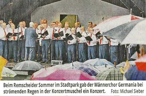 Artikel Bergische Morgenpost v. Dienstag, 14. Juni 2016 Der Männerchor Germania ließ sich auch von schlechtem Wetter nicht aus der Ruhe bringen. VON CRISTINA SEGOVIA-BUENPIA Der Männerchor Germania trotzte am Sonntag dem trüb-nassen Wetter und gab beim Remscheider Sommer wie geplant sein Freiluft- konzert im Stadtpark. Dabei entpuppten sich die vielen Besucher als treue Fans, auf die sich die sangesfreudigen Männer offensicht- lich, selbst bei stark anhaltenden Regen, stets verlassen können.![]() Wie der sprichwörtliche Fels in der Brandung standen sie da: die Fans im Publikum. Unter bunten Regenschir-men, im Schutz der groß gewachsenen Bäume, harr-ten sie aus und lauschten den Liedern des 50-köpfigen Chores. Unter der Leitung von Jürgen Kohlgrüber versuchten diese wiederum, ihren Zuhörern den Aufenthalt an der Kon-zertmuschel mit heiteren Lieder zu versüßen. Im Hin-tergrund stets das Plätschern der prasselnden Regentrop-fen. Der sparsame Beifall nacbjedem Lied war wohl eher darauf zurück zu führen, dass die Hände mit den Regenschirmen besetzt waren, als dass es nicht gefiel. Denn die Leute blieben trotzdem stehen und hörten weiter zu. Dem ein oder anderen wurde es zu kalt, sie verließen leicht durchnässt den Stadt- park, doch die große Mehrheit harrte aus. Dafür bedankte sich Vereinsvorsitzender Heinz-Georg Hüster auch gleich mehrmals: „Vielen Dank dass Sie so tapfer das Geplätscher aushalten." Hin und wieder rappelte sich das Publikum aber doch zu einem hörbaren Beifall auf. Beispielsweise als Chorleiter Jürgen Kohlgrüber zwei Soli sang. Als der Chor den „Deutschmeister Regiments- marsch“ zum Besten gab, tanzten auch einige Regenschirme mit, welche die Besucher auf und ab zum Takt bewegten. Der Marsch heiterte die Besucher sichtlich auf. Sein rund 30-minütiges Konzert beendete der MG Germania schließlich mit dem Publikum. Zusammen sangen sie das Bergische Heimatlied, in einer Kulisse, die dafür wie geschaffenen ist: Im verregneten Grün des Remscheider Stadtparks. Von Remscheider Sommer keine Spur. Wie der sprichwörtliche Fels in der Brandung standen sie da: die Fans im Publikum. Unter bunten Regen- schirmen, im Schutz der groß gewachsenen Bäume, harrten sie aus und lauschten den Liedern des 50-köpfigen Chores. Unter der Leitung von Jürgen Kohlgrüber versuchten diese wiederum, ihren Zuhörern den Aufenthalt an der Konzertmuschel mit heiteren Lieder zu versüßen. Im Hintergrund stets das Plätschern der pras- selnden Regentropfen. Der sparsame Beifall nacbjedem Lied war wohl eher darauf zurück zu führen, dass die Hände mit den Regenschirmen besetzt waren, als dass es nicht gefiel. Denn die Leute blieben trotzdem stehen und hörten weiter zu. Dem ein oder anderen wurde es zu kalt, sie verließen leicht durchnässt den Stadt- park, doch die große Mehrheit harrte aus. Dafür bedankte sich Vereinsvorsitzender Heinz-Georg Hüster auch gleich mehrmals: „Vielen Dank dass Sie so tapfer das Geplätscher aushalten." Hin und wieder rappelte sich das Publikum aber doch zu einem hörbaren Beifall auf. Beispielsweise als Chorleiter Jürgen Kohlgrüber zwei Soli sang. Als der Chor den „Deutschmeister Regiments- marsch“ zum Besten gab, tanzten auch einige Regenschirme mit, welche die Besucher auf und ab zum Takt bewegten. Der Marsch heiterte die Besucher sichtlich auf. Sein rund 30-minütiges Konzert beendete der MG Germania schließlich mit dem Publikum. Zusammen sangen sie das Bergische Heimatlied, in einer Kulisse, die dafür wie geschaffenen ist: Im verregneten Grün des Remscheider Stadtparks. Von Remscheider Sommer keine Spur. |