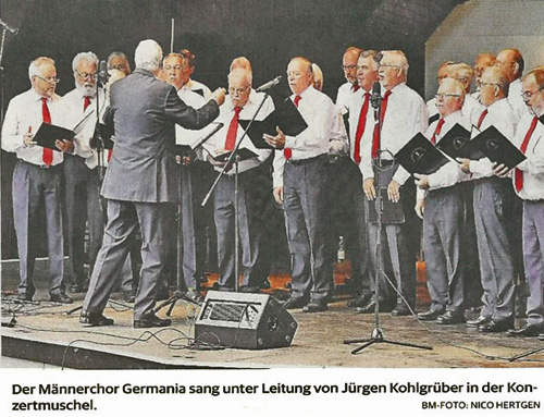 Artikel Remscheider General-Anzeiger v. 14. Juni 2016 „Kessel Buntes“ gefällt dem Publikum Der Remscheider Männerchor Germania trat im Stadtpark auf und bot ein tolles Konzert. Von Sabine Naber Welchen hohen Stellenwert die Chor-musik hier hat und natürlich auch, wie beliebt der Rem-scheider Männerchor Ger-mania ist, das konnten die Besucher am Sonntagnach-mittag im Stadtpark sehen. Trotz strömenden Regens ka-men die Zuhörer, als die Sänger dm Rahmen der Ver-anstaltungsreihe „Remscheider Sommer“ zur Konzertmuschel eingeladen hatten, und lauschten dem rund 45-minütigen Pro-gramm.Zwar blieben die Bänke leer, aber die Gäste standen unter ihren aufgespannten Schirmen und genossen das Programm unter der Überschrift „Ein Kessel Buntes“. Dirigiert wurden die Sänger, die mit ihren weißen Hemden und leuchtend roten Krawatten Farbe in den verregneten Nachmittag brachten, nicht von Claudia Rübben-Laux, sondern von Jürgen Kohlgrüber. Der Sänger und Vizedirigent des Chores leitet auch den „kleinen Chor“ und trat in der Konzertmuschel als Solist auf. Vom Keyboard begleitet sang er mit seiner Bassstimme die Lieder „In der Waldschänke“ und „Herzenswunsch“. Der Chor, zu dem 60 Aktive zählen, begeisterte einmal mehr durch seinen ausgewogenen Klang- körper und die vortrefflich geschulten Stimmen. Vor allem Volkslieder wie „Und wieder blühet die Linde“, „Die Rose“ oder auch „Timokwein“ sangen die Männer, Und luden zum Abschluss ein, die erste und vierte Stro- phe des Bergischen Heimatliedes mit den Zuhörern gemeinsam zu singen. Ein kleiner, sorgfältig ausgewählter Querschnitt durch das Repertoire des Chores, der den Zuhörern hörbar gefiel; denn es ist ja nicht so einfach, mit Schirm in der Hand zu applaudieren... Die Sänger proben montags im Autobahn-Hotel Vorsitzender Hans-Georg Hüster nutzte den Auftritt, um die männlichen Besucher einzuladen, bei den Proben vorbeizuschauen: „In diesem Monat proben wir noch im CVJM-Heim in Lüttringhausen, ab Juli wieder an unserem angestammten Probenort im BAB-Hotel an der Talsperre. Immer montags von 19.45 bis 21.45 Uhr.“ Der Männerchor Germania, der sich 1871 unter dem Namen „Gesangverein Germania" gegründet hatte, 1983 mit dem Traditionsverein „Männerchor Germania“ fusionierte und sich seitdem Rem- scheider Männerchor Germania nennt, zählt zu den ältesten Vereinen im Chorverband NRW. |
