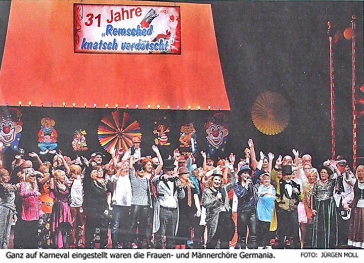 Artikel Bergische Morgenpost v. Montag, 04. März 2019 Schunkeloffensive im Theatersaal VON CHRISTINA SEGOVIA-BUENDlA Mehrere hundert kostümierte Besucher sorgten für beste Stimmung bei der Karnevalsparty „Knatsch verdötscht“. Die Germania-Chöre sowie das Ensemble der Lüttringhauser Volksbühne zeigten ein jeckes Programm. ![]() INNENSTADT Rund 600 Besucher feierten fröhlich mit, als der hiesige Frauenchor und der Männerchor Germania das Stadttheater am Samstagnachmittag für mehrere Stunden in eine närrische Hochburg verwandelten. Zur 31. Auflage des jecken Mitmachkonzerts „Rem-sched knatsch verdötsch" ging es, auf der Bühne und im Zuschauerraum, kunterbunt und heiter her. Wenn Theatergäste mehr Glitzer im Gesicht tragen als die Künstler auf der Bühne und ihnen kostümtechnisch in nichts nachstehen; wenn das Publikum fast die größere Performance hinlegt als jene, die im Rampenlicht stehen, und wenn im Kulturtempel dann noch Dosenbier, Gurkensnacks und Käsehäppchen Einzug einziehen, dann steht die Welt Kopf, dann ist „Remsched knatsch verdötscht“. Lange bevor sich der Vorhang öffnete und erstmals die bunt verkleideten Sängerinnen und Sänger beider Chöre von Dirigentin Claudia Rübben-Lauxzum Vorschein kamen, hatte die Party im Zuschauer-raum längst begonnen: Mehrere hundert kostümierte Besucher, sangen schon im bunt dekorierten Theatersaal zu bekannten Karneval-hits aus der Konserve, tanzten und schwangen blinkende Leuchtwedel. „Ja was ist denn hier los?", fragte eine amüsierte Dirigentin, als sie mit ihren Chören die Bühne betrat und sah, dass das Publikum schon ohne sie losgelegt hatte. „Die Stimmung ist ja schon jetzt großartig. Dabei haben wir haben noch gar nicht angefangen." Mit der Kölschen Hymne „Mer losse d’r Dom en Kölle" stieg der Remscheider Frauenchor in das mehrstündige Konzert ein. Ein kurzes Potpourri aus diversen Partyhits, wie „Die Rose" (De Räuber), „Pizza Wundaba“ (Höhner) oder „Schön ist das Leben“ (Paveier) folgte. Die Stimmung, wenige Minuten nach Konzertbeginn, war zu diesem Zeitpunkt schon bestens. In kleineren und größeren Gruppen, auch in gemischten Formationen, traten dann immer wieder Männer und Frauen in unterschiedlichen Kostümi Hingen in den Vordergrund und präsentierten einzelne Klassiker, die das Publikum textsicher mitsang. Für einen ersten Jubelsturm sorgte der erste Auftritt der Germania, als Rübben-Laux ihre sangesfreudigen Herren als „die schönsten Männer von Remscheid“ ankündigte. Einige Gäste blieben nahezu über das komplette Konzert auf den Beinen, tanzten und schwangen ihre mitgebrachten Schellenkränze mehr oder minder zum Takt. Andere erhoben sich immer wieder von ihren Plätzen zur gemeinsamen Schunkel-Of-fensive. Die gute Laune zogen sich durch den kompletten Saal und wirkte ansteckend. Doch nicht nur musikalisch hatte das fast fünfstündige Programm allerhand zu bieten: Christian Wüster und Steffi Hoff-mann, Vertreter der Lüttringhauser Volksbühne, präsentierten, ebenso wie Eigengewächse des Frauenchores, humorvolle Sketch. Es gab Büttenreden und die Kölner Tanzgarde „Höppemötzcher" schaute ebenfalls zur mittlerweile schon traditionellen Stippvisite vorbei. Einen kleinen Höhepunkt lieferte auch der CDU-Landtagsabgeord-nete Jens Nettekoven: Im FC Trikot löste er sein Versprechen ein, trat auf die Bühne und gab - mit Unterstützung der Frauen und Männer im Hintergrund, sowie des Publikums vor ihm - das sehr Heimat verbundene Lied „En unsrem Vee-del“ (Black Föös) zum Besten. |