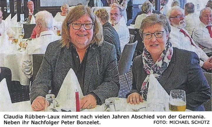 Artikel Bergische Morgenpost v. Dienstag, 19. März 2019 Neustart beim Männerchor Peter Bonzelet löst bei der Germania Claudia Rübben-Laux als Leiter ab. REMSCHEID (sli) Ganz im Zeichen eines Neustarts geht im Remscheider Männerchor Germania 1840 eine Ära zu Ende. Eine Ära, die über 53 Jahre den Remscheider Traditionschor prägte wie mutmaßlich keine zweite. Anlässlich der feier- lichen Verabschiedung der Musikdirektorin und langjährigen Leiterin des MGV Germania, Claudia Rübben-Laux, im BAB-Hotel begrüßte der Vorstand den neuen Leiter, Musikdirektor Peter Bonzelet. ![]() „Wir freuen uns, dass Peter Bonzelet die Leitung ab dem 28. März übernehmen wird und hoffen, dass er viele neue Ideen mit einbringt“, äußerte sich der 1. Vorsitzende, Heinz-Georg Hüster. Seit 1966 prägte die Familie Rübben - lange Jahre unter Prof. Hermannjosef Rübben, ab 1997 dann unter seiner Tochter Claudia - das Können des Gesangvereins. „Prof. Rübben führte seine Tochter früh an alle Facetten der Musik heran“, betonte Vorsitzender Hüster in seiner Rede. „So wurde der Grundstein zur Musik gelegt, und die Leitung konnte später in bewährte Hände übergeben werden.“ Denn unter der Ära Rübben erreichten die Germanen 2008 sowie 2013 nicht nur die Titel „Meisterchor NRW“ und „Konzertchor NRW“, sondern prägten mit bewährten Veranstaltungen wie „Remsched knatsch verdötscht“ und Konzerten das Remscheider Konzert- und Kulturleben. „Ich bin quasi erwachsen geworden mit dem Chor“, erzählt Claudia Rübben-Laux. „Die Entscheidung zu gehen, habe ich mir auch nicht leicht gemacht.“ Mit ihrem neuen Leiter erhoffen sich die MGVler nicht nur frischen Wind, sondern auch eine Weiterführung in die nächste Generation sowie Anwerbung von Neumitgliedern. „Mit gleich zwei neuen Projekten - einem Konzert in den Balver Höhlen im Sauerland sowie einem Musical- und Operetten-Konzert in der Stadthalle Wuppertal - möchten wir Sänger einladen, die für ein halbes Jahr bei uns mitsingen möchten“, äußerte sich Bonzelet zu kommenden Zielen. Selbstverständlich werden auch Kölsche Tön' einen Platz im Repertoire der Germanen einnehmen. | ||
