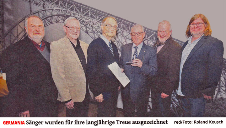 Artikel Remscheider General-Anzeiger v. Samstag, 28. Dezember 2019 GERMANIA Sänger wurden für ihre langjährige Treue ausgezeichnet ![]() Traditionsgemäß veranstalten die aktiven Sänger vom Remscheider Männerchor Germania 1840 nach dem Weihnachtskonzert ihr Jahresabschlussessen, das sie stets mit den Ehrungen der Jubilare verbinden. Für 50 Jahre Singen im Remscheider Männerchor Germania und für 50 Jahre Mitgliedschaft im Chorverband Nordrhein-Westfalen wurden diesmal Jürgen Peter Korth und Peter Schneeloch ausgezeichnet. Bernd Fischer wurde für 65 Jahre im NRW-Chorverband geehrt. Mit ihnen freuten sich der Germania-Vorsitzende Heinz Georg Hüster, Chorleiter Peter Bonzelet und Wolf-Dietrich Hörle, der als Vorsitzender des Bergischen Chorverbands/Remscheid mit dabei war und gemeinsam mit Heinz Georg Hüster die Ger-mania-Jubilare ehrte. | ||